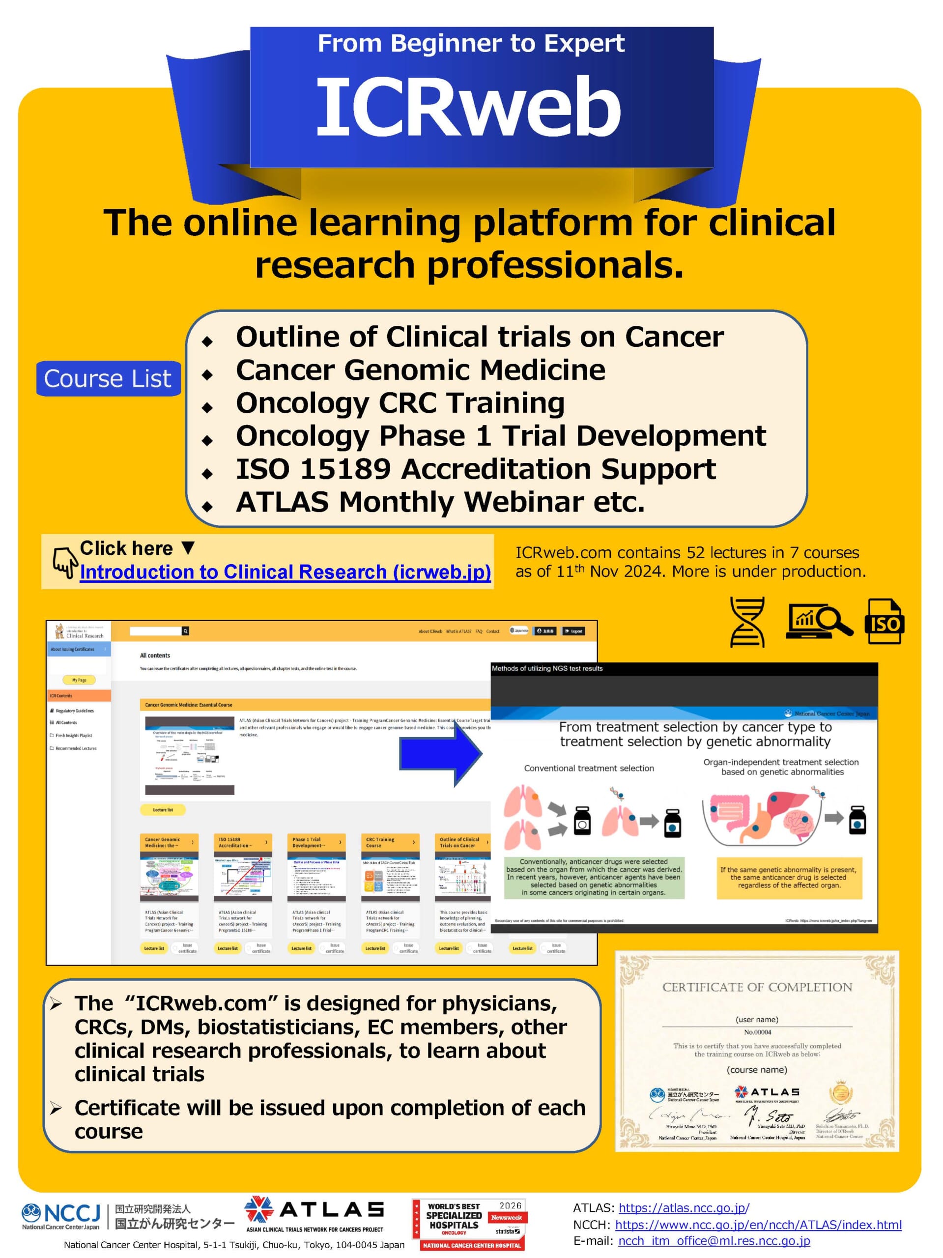 ATLASプロジェクトでは、日本だけでなく海外の方へその対象を拡大するため、新たに英語版のコンテンツを構築しました。がん臨床試験における最近のトピックである、がんゲノム医療コース、ISO 15189・がん遺伝子検査室の認証取得コース、がんPhase 1試験コース、がんCRCコースなどで、臨床研究を行う上で必須となる知識の習得が可能となるようデザインされています。