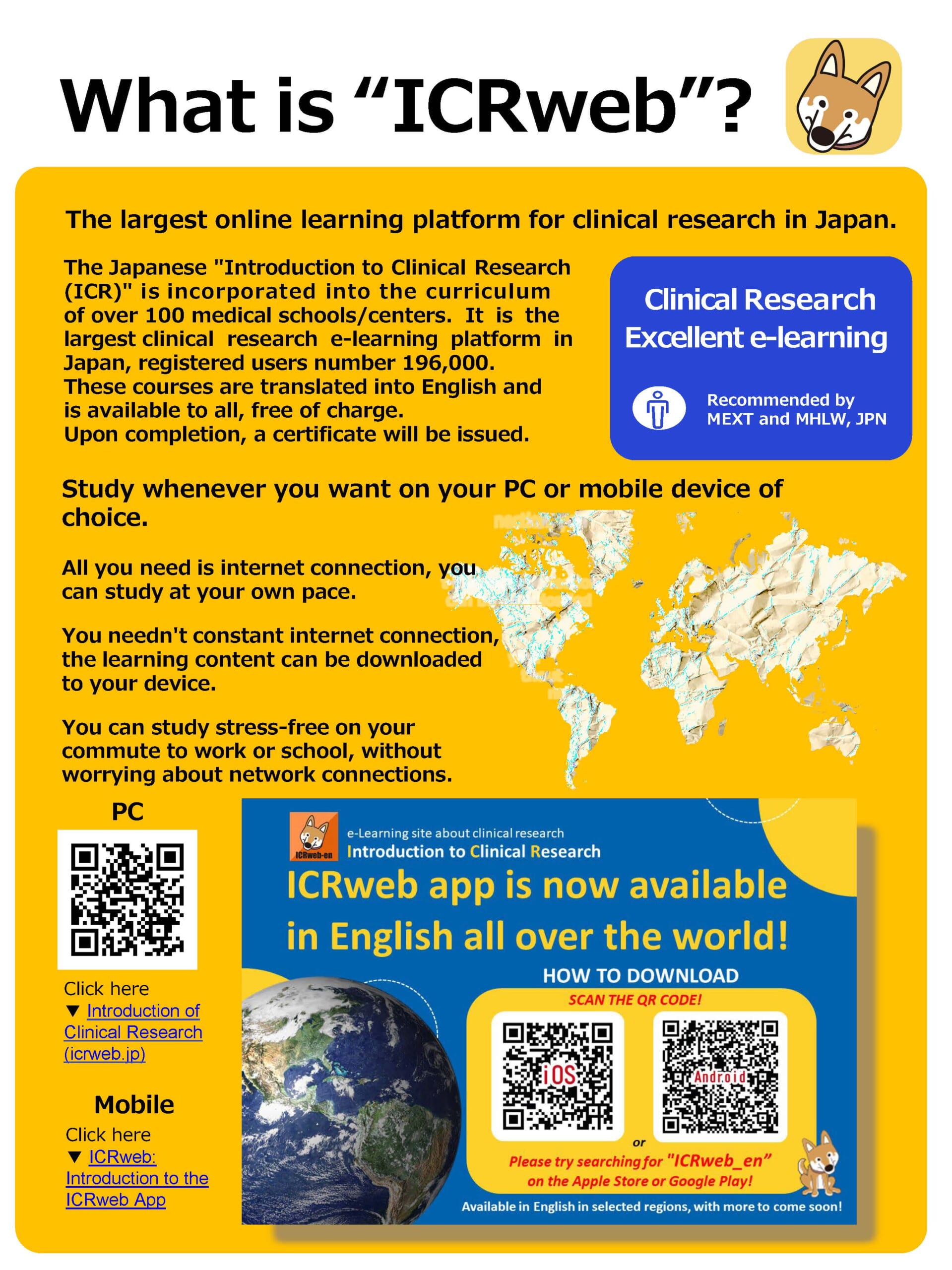 ICR臨床研究入門(略称:ICRweb)は、国立がん研究センターにより運営されているインターネットを介した教育プログラムであり、臨床研究教育プログラムの作成と普及を目標としています。教育の提供に加え、臨床研究に関する最新情報や役立つ情報の提供、および臨床研究に携わる人々への情報交換の場の提供を目指しています。