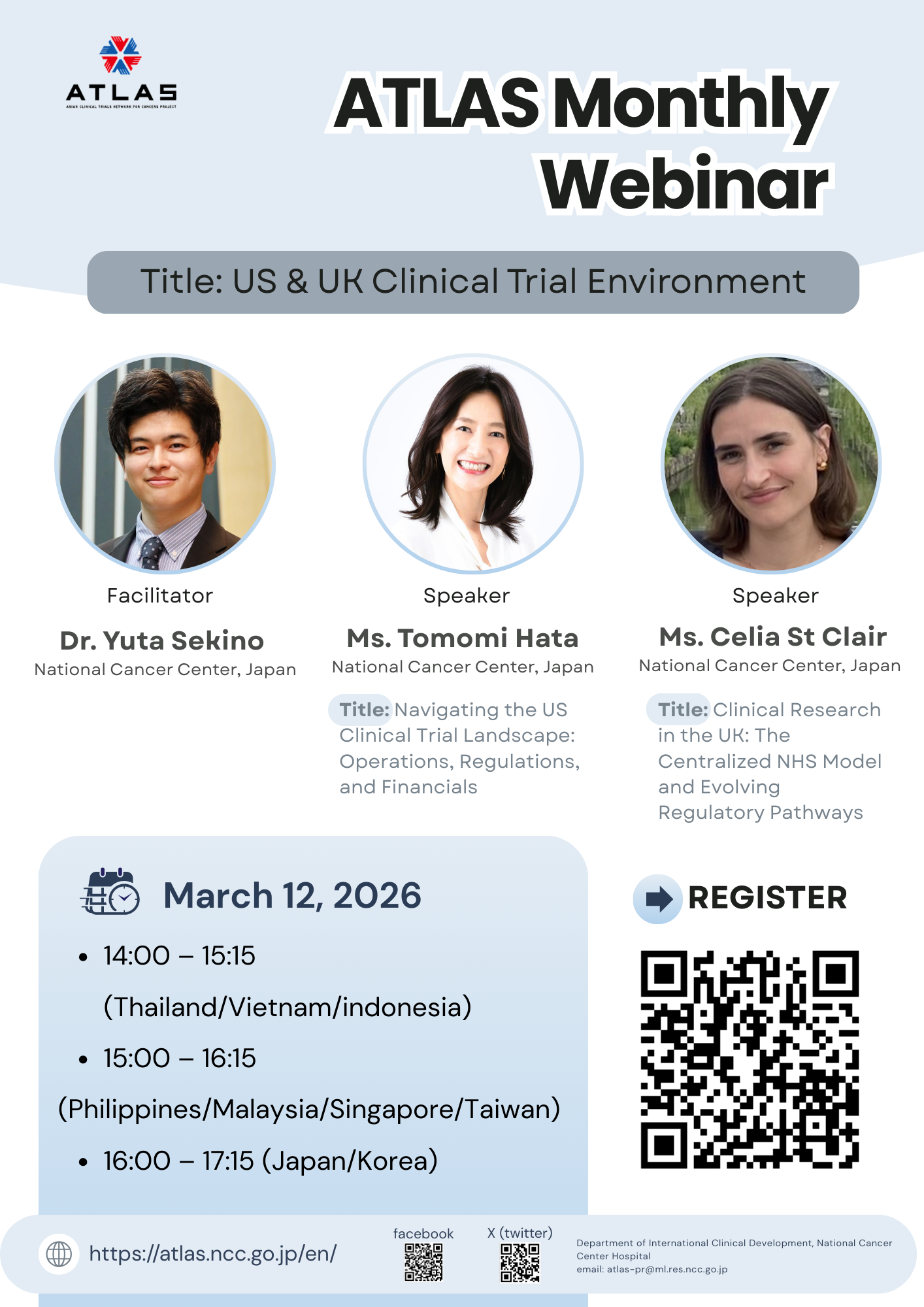 The Asian Clinical Trials Network for Cancers Project (ATLAS Project) is an initiative led by the National Cancer Center Hospital to establish a regional clinical trial network for cancer across Asia. Launched in September 2020 with support from the Japan Agency for Medical Research and Development (AMED), ATLAS aims to accelerate international collaboration in the development of pharmaceuticals and medical devices.