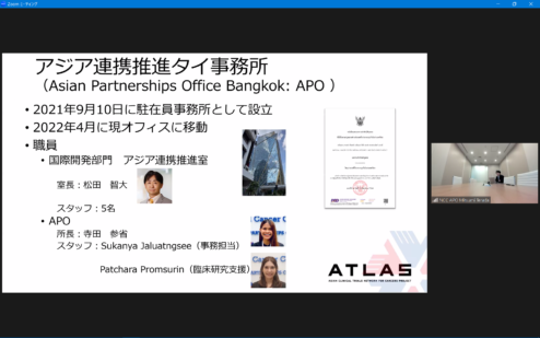 2023年3月8日(水)17時から、国立がん研究センター研究所において、ATLASの研究者による成果報告会が開催されました。当日は現地会場であるセミナールームに約30名の参加者が集まりました。またオンラインでも60名の方が参加され、大変盛況のうちに幕を閉じました。2020年9月より開始されたATLASプロジェクトのこれまでの実績について、多くの方々に知って頂くきっかけになったと思います。